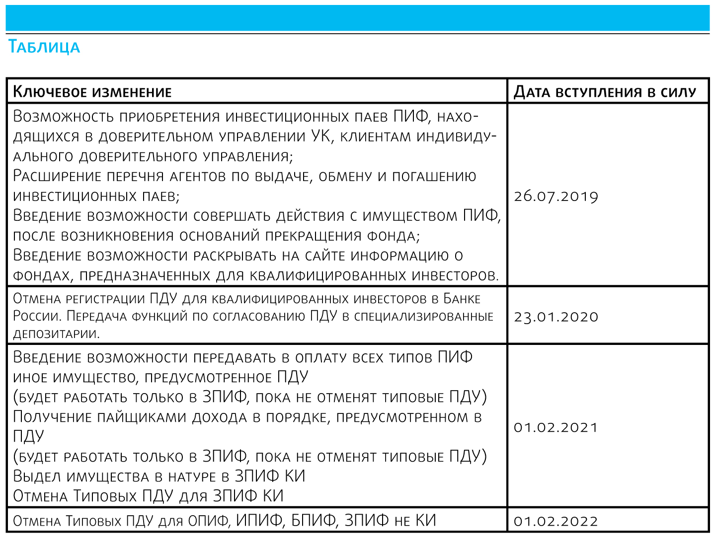 Следующий блок изменений вступит в силу с 23.01.2020 года и будет связан с изменением процедуры регистрации правил доверительного управления закрытыми паевыми инвестиционными фондами, предназначенными для квалифицированных инвесторов.