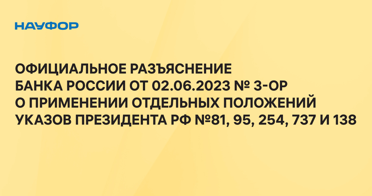 1. Руководствуясь пунктом 13 Указа Президента Российской Федерации от 5 марта 2022 года № 95 «О временном порядке исполнения обязательств перед некоторыми иностранными кредиторами» (далее – Указ № 95), пунктом 9 Указа Президента Российской Федерации от 4 мая 2022 года № 254 «О временном порядке исполнения финансовых обязательств в сфере корпоративных отношений перед некоторыми иностранными кредиторами» (далее – Указ № 254), пунктом 8 Указа Президента Российской Федерации от 15 октября 2022 года № 737 «О некоторых вопросах осуществления (исполнения) отдельных видов сделок (операций)» (далее – Указ № 737), пунктом 13 Указа Президента Российской Федерации от 3 марта 2023 года № 138 «О дополнительных временных мерах экономического характера, связанных с обращением ценных бумаг» (далее – Указ № 138), Банк России разъясняет вопросы применения отдельных положений Указа Президента Российской Федерации от 1 марта 2022 года № 81 «О дополнительных временных мерах экономического характера по обеспечению финансовой стабильности Российской Федерации» (далее – Указ № 81), Указа № 95, Указа № 254, Указа № 737, Указа № 138.