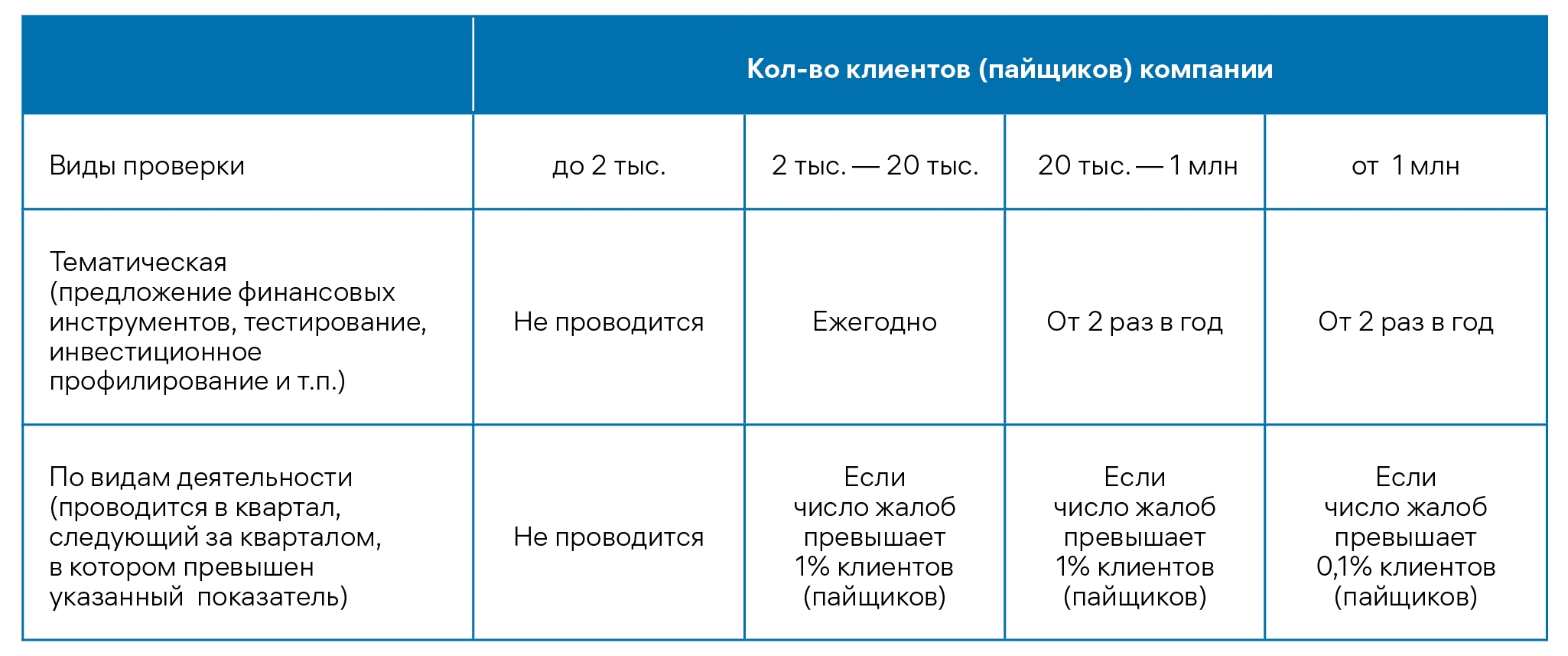 НАУФОР придерживается риск-ориентированных подходов при принятии решений о проверке. Учитывается системная/социальная значимость организации, число клиентов, количество жалоб: