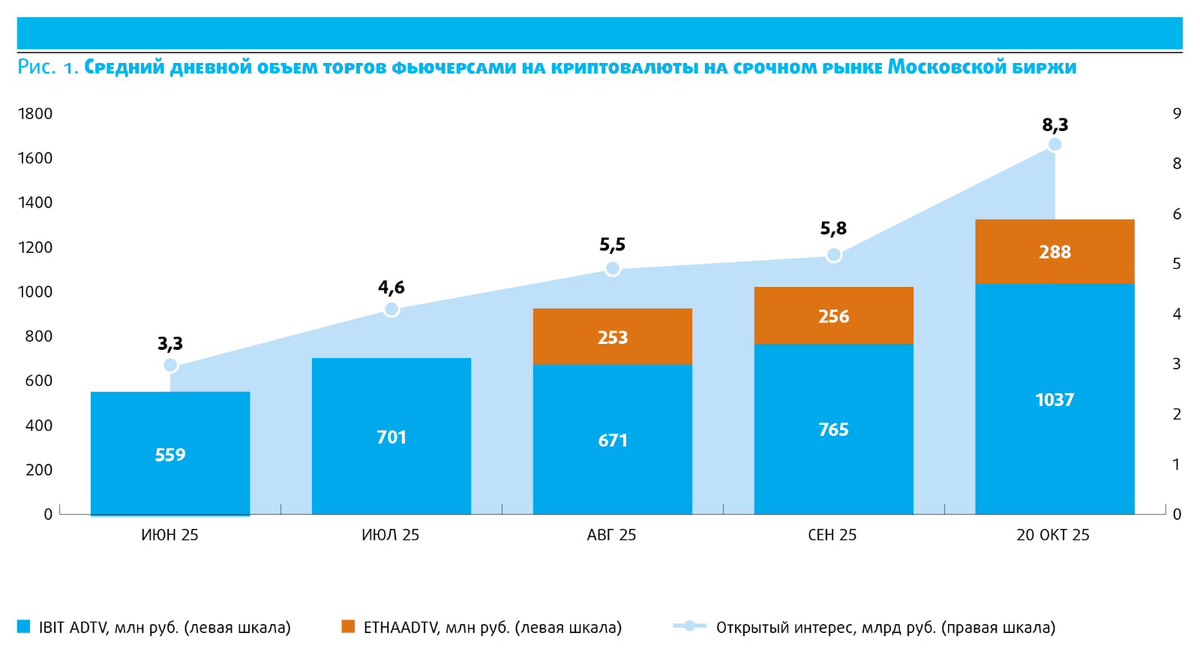 Новые продукты сразу же оказались востребованы на торгах срочного рынка Московской биржи. Средний дневной объем торгов фьючерсом на Биткоин за несколько месяцев торгов удвоился и по состоянию на конец октября 2025 года превышает 1 млрд руб. Открытый интерес обоих фьючерсов к концу октября вырос почти втрое по сравнению с уровнем июня и превышает 8 млрд руб. Контракты входят в топ-3 по объему торгов среди новых фьючерсов Московской биржи и регулярно подтверждают свою востребованность, обновляя рекорды.