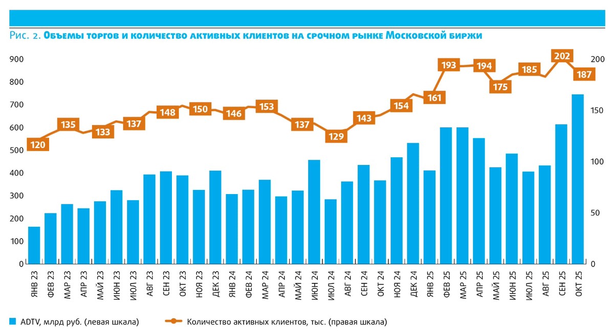 В результате многочисленных запусков успешных инструментов, активного развития ликвидности в текущих контрактах объемы торгов и количество активных клиентов на срочном рынке осенью 2025 обновили максимумы.