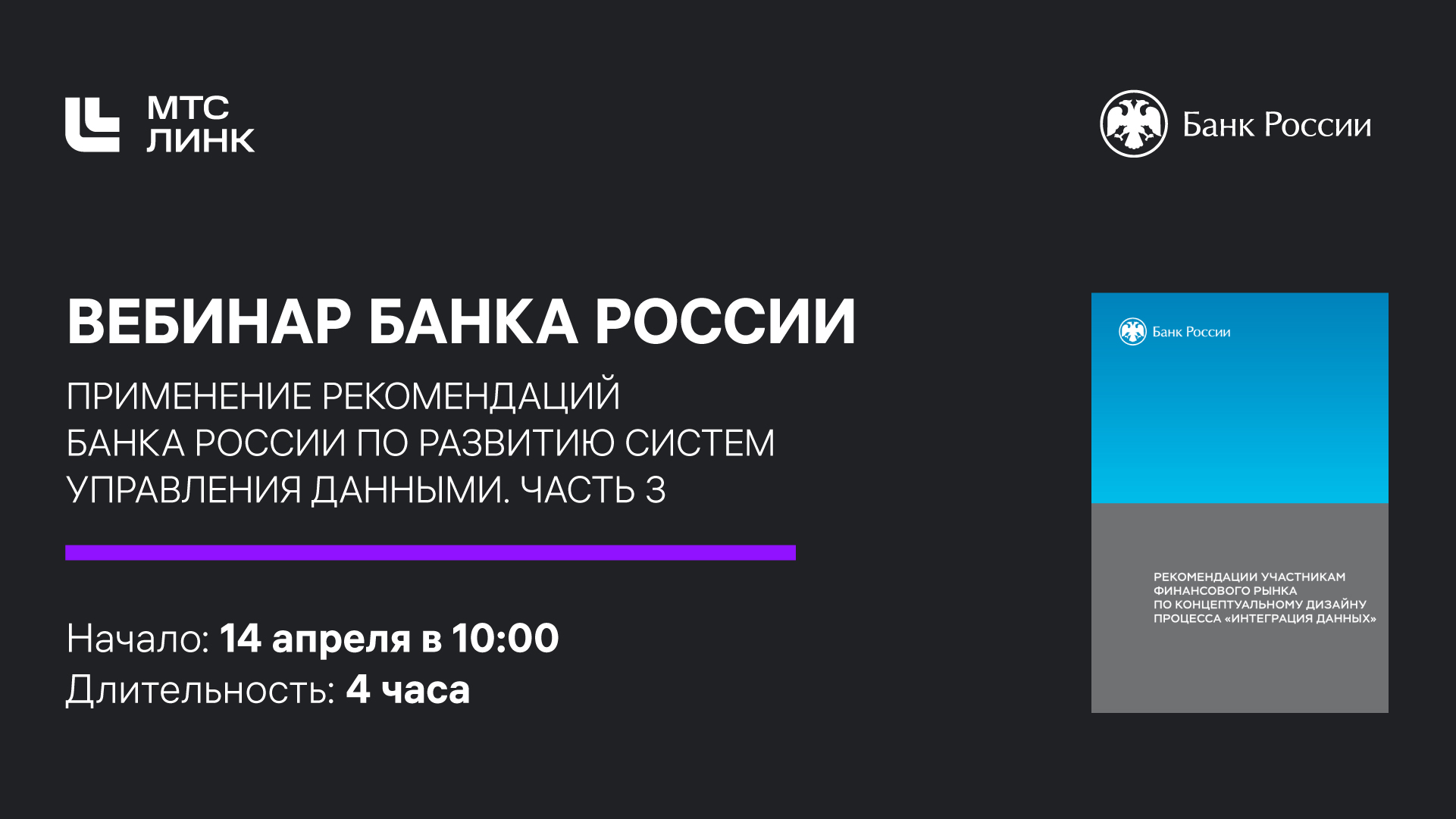 14 апреля с 10:00 до 14:00 (по московскому времени) пройдет вебинар «Применение рекомендаций Банка России по развитию систем управления данными участников финансового рынка. Часть 3. Интеграция данных. Политика управления данными. Управление рисками данных». Вебинар организован Департаментом данных, проектов и процессов Банка России совместно с Университетом Банка России и участниками Рабочей группой по вопросам развития систем управления данными участников финансового рынка.