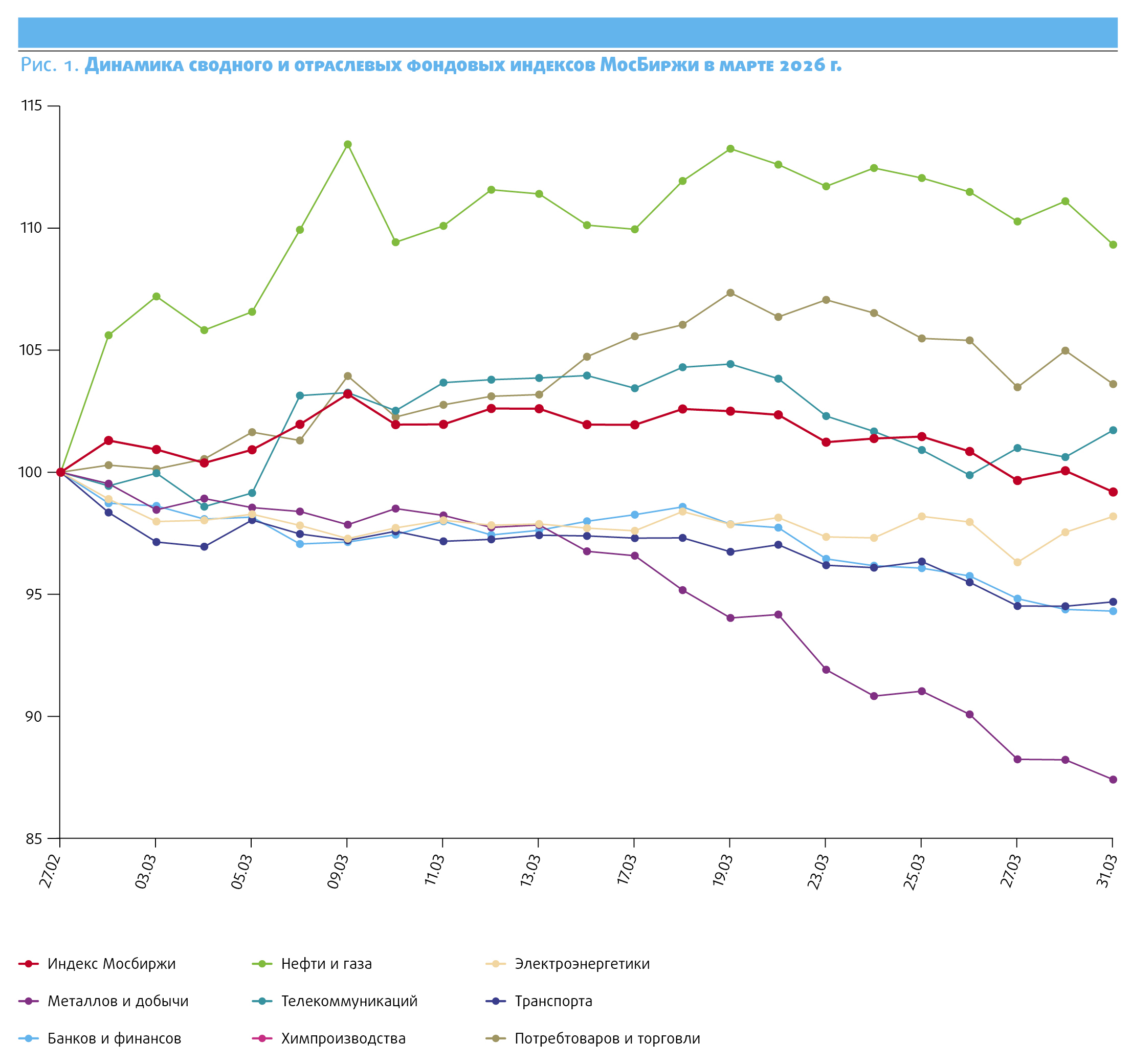 Российский рынок акций начал март с роста вслед за раллировавшими мировыми ценами на нефть и драгметаллы (фьючерс на нефть Brent протестировал отметку $100 за баррель, а стоимость золота поднималась выше $5400 за тройскую унцию) после нападения США и Израиля на Иран, а также благодаря данным Росстата о замедлении темпов инфляции. При этом индекс МосБиржи к концу первой декады месяца обновил максимум с сентября 2025 года, локально превысив отметку 2900 пунктов во главе с бумагами нефтегазовых компаний.