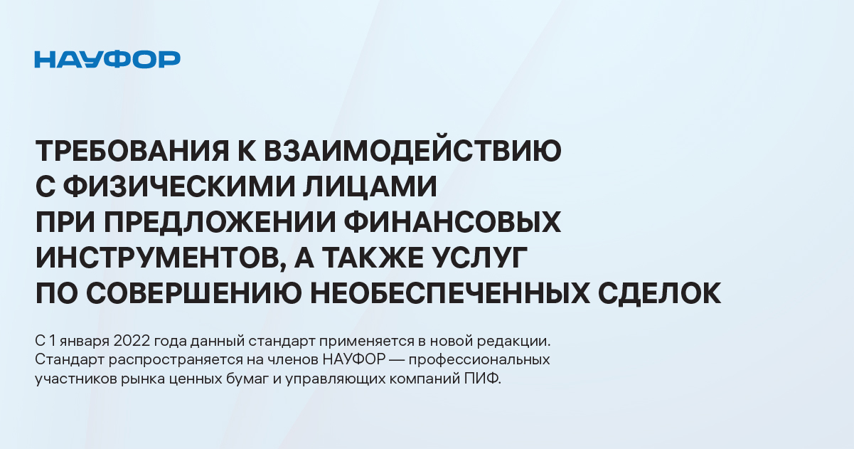 Настоящий Внутренний стандарт «Требования к взаимодействию с физическими лицами при предложении финансовых инструментов, а также услуг по совершению необеспеченных сделок» (далее - Внутренний стандарт) разработан в соответствии с частью 2 статьи 6 Федерального закона от 13 июля 2015 года № 223-ФЗ «О саморегулируемых организациях в сфере финансового рынка» в целях развития финансового рынка Российской Федерации, защиты прав и интересов потребителей финансовых услуг. Настоящий Внутренний стандарт устанавливает требования к лицам, имеющим право на осуществление брокерской деятельности, деятельности по управлению ценными бумагами и денежными средствами, предназначенными для инвестирования в ценные бумаги, дилерской деятельности, депозитарной деятельности, деятельности по инвестиционному консультированию, деятельности по управлению инвестиционными фондами, паевыми инвестиционными фондами, негосударственными пенсионными фондами при предложении финансовых инструментов, а также услуг по совершению необеспеченных сделок физическим лицам.