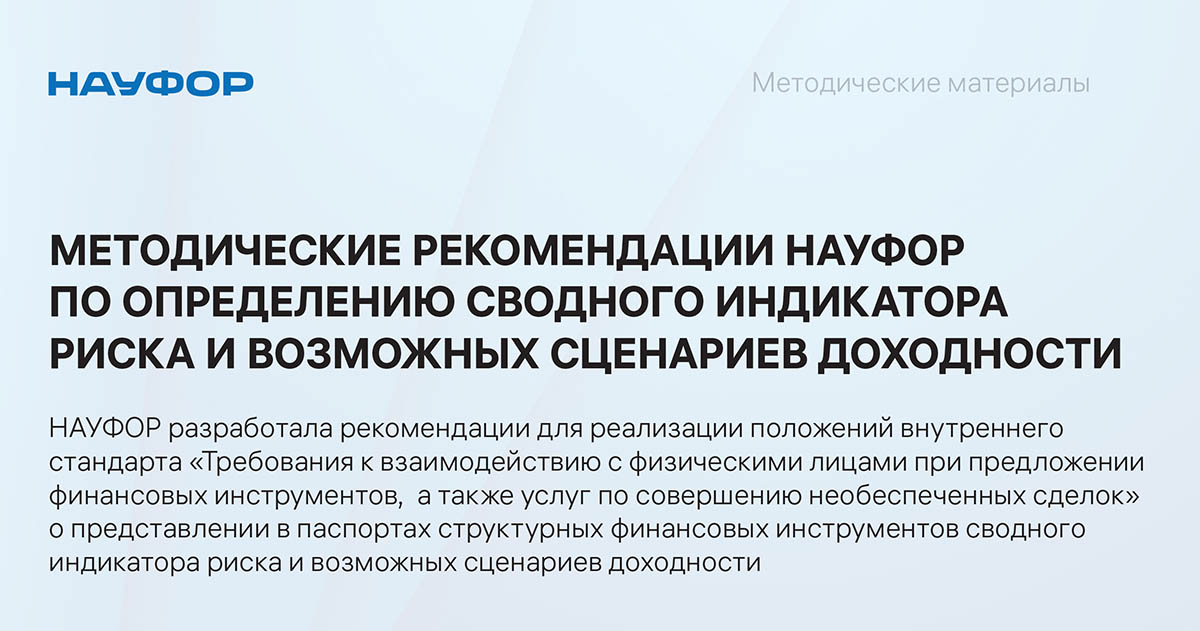 НАУФОР разработала методические рекомендации по определению сводного индикатора риска, возможных сценариев доходности структурных финансовых инструментов и представлению соответствующей информации в паспортах финансовых инструментов для реализации положений стандарта «Требования к взаимодействию с физическими лицами при предложении финансовых инструментов, а также услуг по совершению необеспеченных сделок».