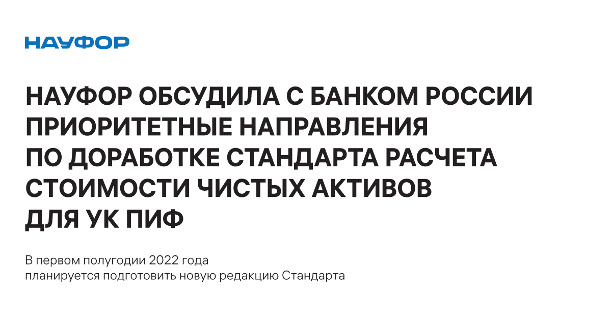 Рабочая группа НАУФОР по доработке Стандарта порядка определения стоимости чистых активов обсудила с представителями Банка России приоритетные направления по доработке стандарта, которые состоятся в текущем году. Основными направлениями, в том числе, определены: