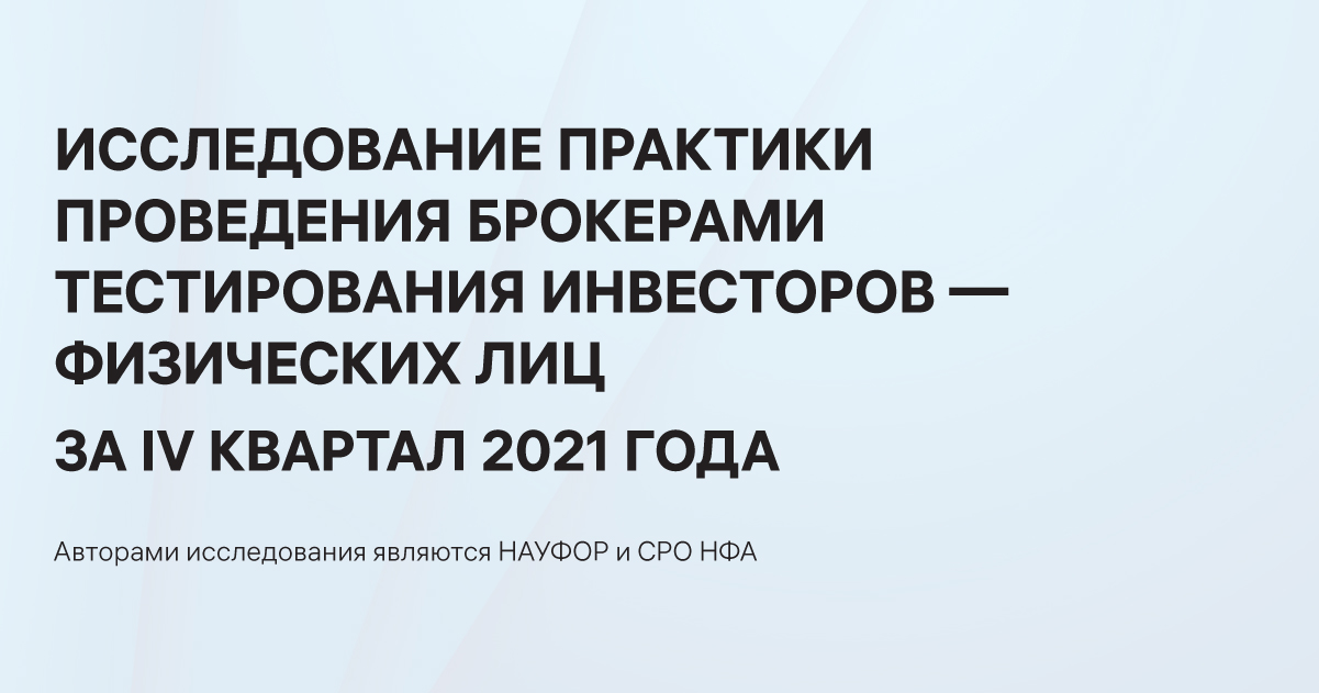 НАУФОР и СРО НФА провели совместное исследование практики проведения брокерами тестирования клиентов - физических лиц, не являющихся квалифицированными инвесторами, предусмотренного Базовым стандартом защиты прав и интересов физических и юридических лиц - получателей финансовых услуг, оказываемых членами саморегулируемых организаций в сфере финансового рынка, объединяющих брокеров.