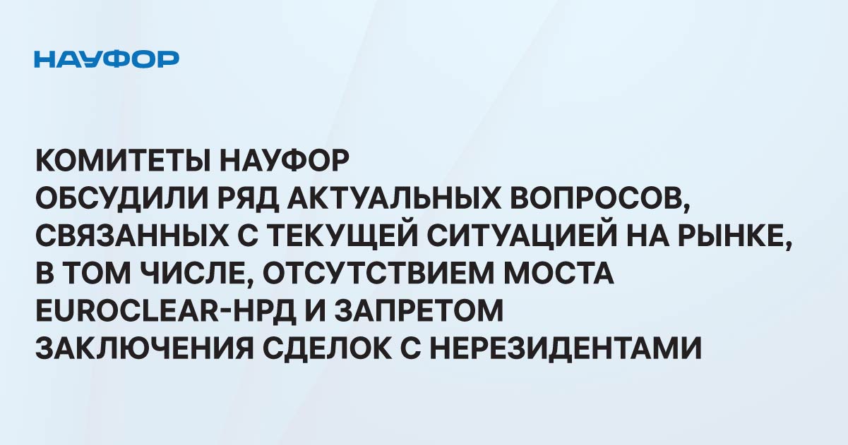 Комитеты НАУФОР по управлению рисками, по брокерской деятельности и по внутреннему контролю (подкомитет УК) провели в среду, 25 мая, совместное заседание, на котором обсудили ряд актуальных вопросов деятельности профессиональных участников рынка ценных бумаг и управляющих компаний, связанных с текущей ситуацией на рынке, в том числе, отсутствием моста Euroclear-НРД и запрета заключения сделок с нерезидентами.