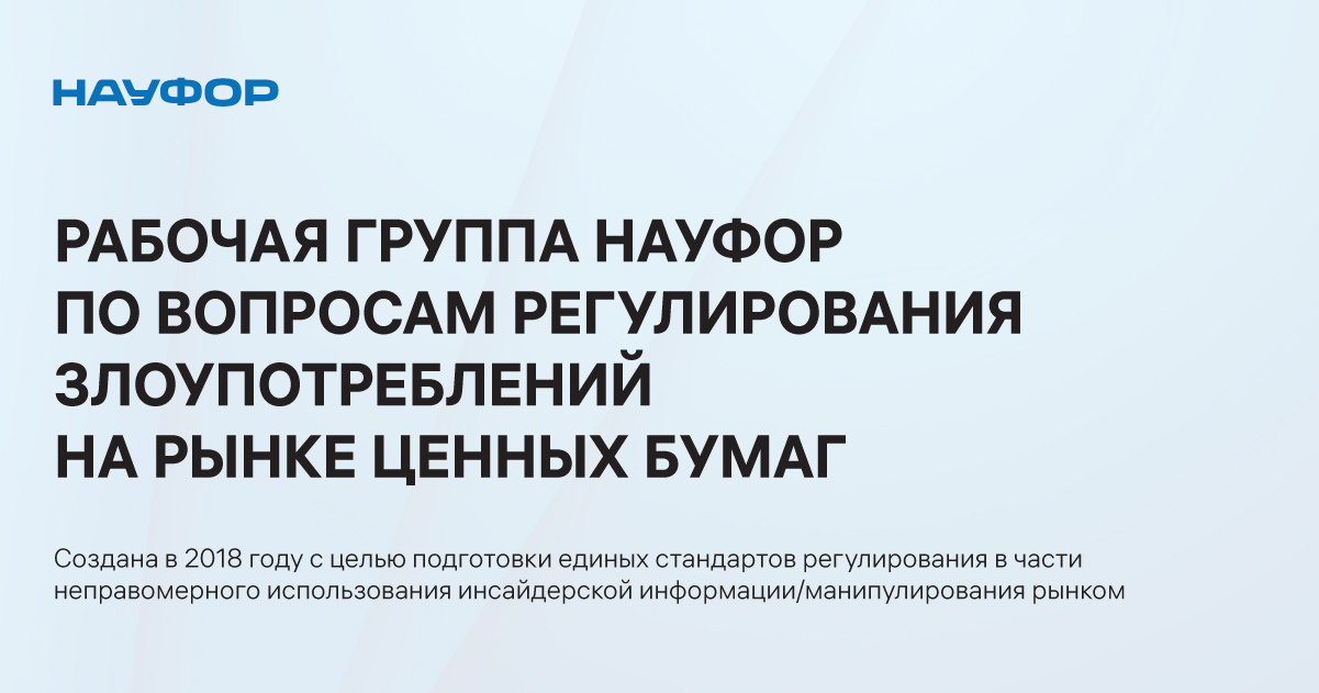 Рабочая группа НАУФОР была создана в сентябре 2018 года с целью подготовки единых стандартов регулирования в части неправомерного использования инсайдерской информации/манипулирования рынком. Возглавляет группу Ирина Грекова, управляющий директор по комплаенс и этике бизнеса ПАО Московская биржа.