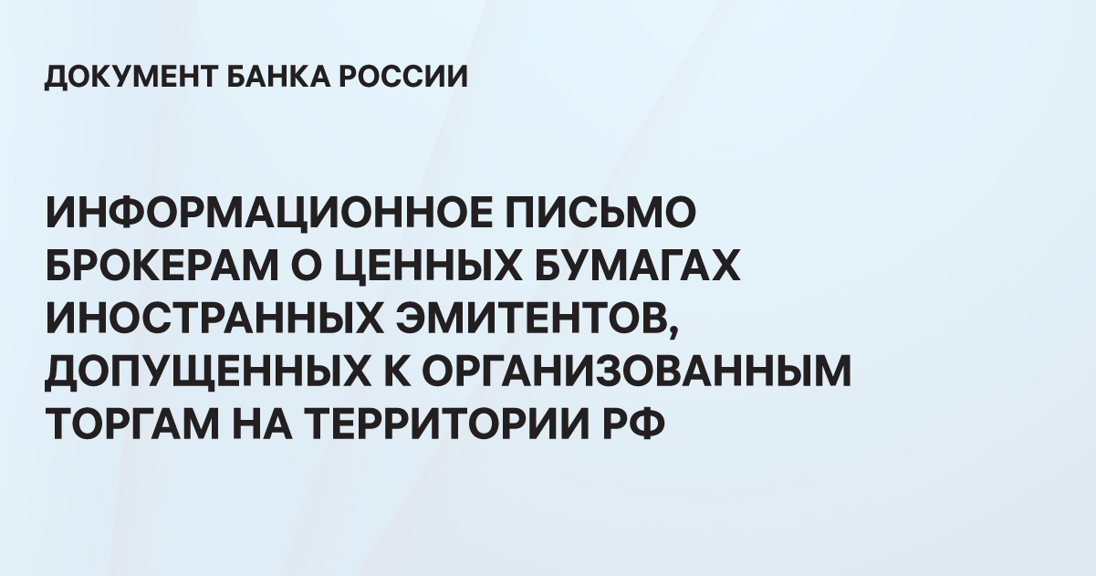 Банк России опубликовал информационное письмо о ценных бумагах иностранных эмитентов, допущенных к торгам на территории РФ, в котором рекомендовал профессиональным участникам рынка ценных бумаг, осуществляющим брокерскую деятельность,
