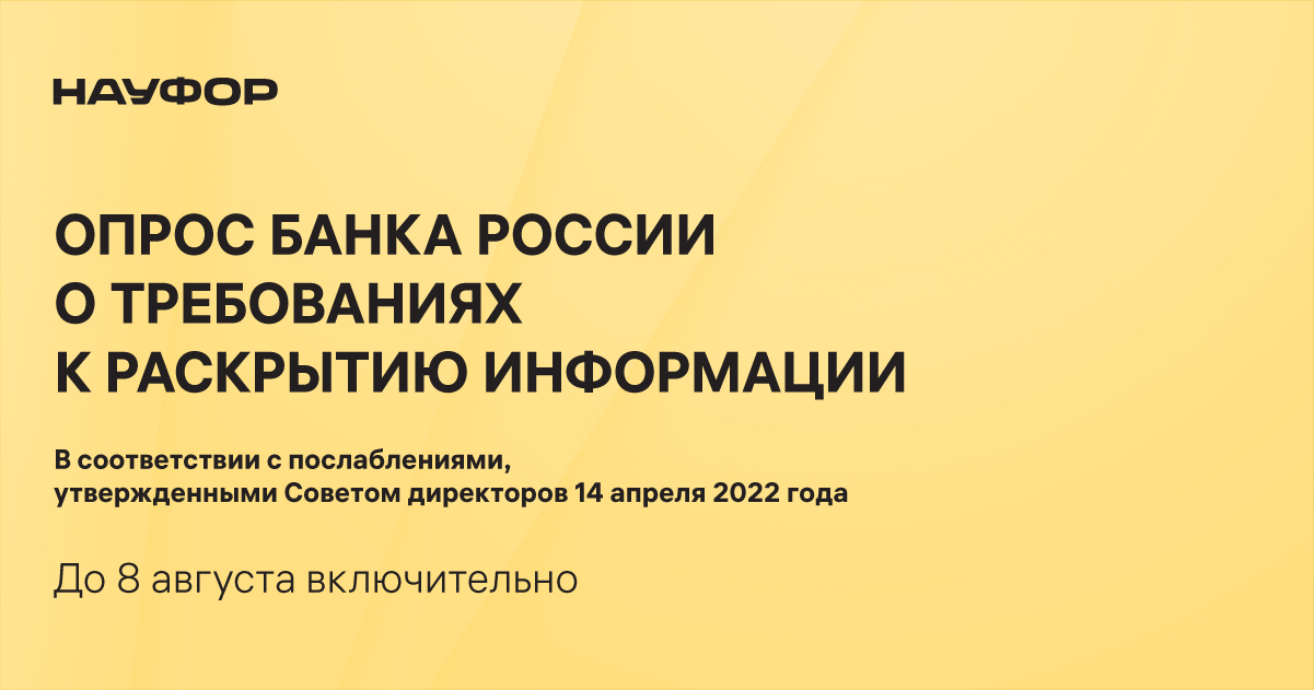 просим вас принять участие в опросе, который проводится НАУФОР по просьбе Банка России в целях рассмотрения регулятором вопроса о сохранении послаблений1 в части раскрытия информации некредитными финансовыми организациями.