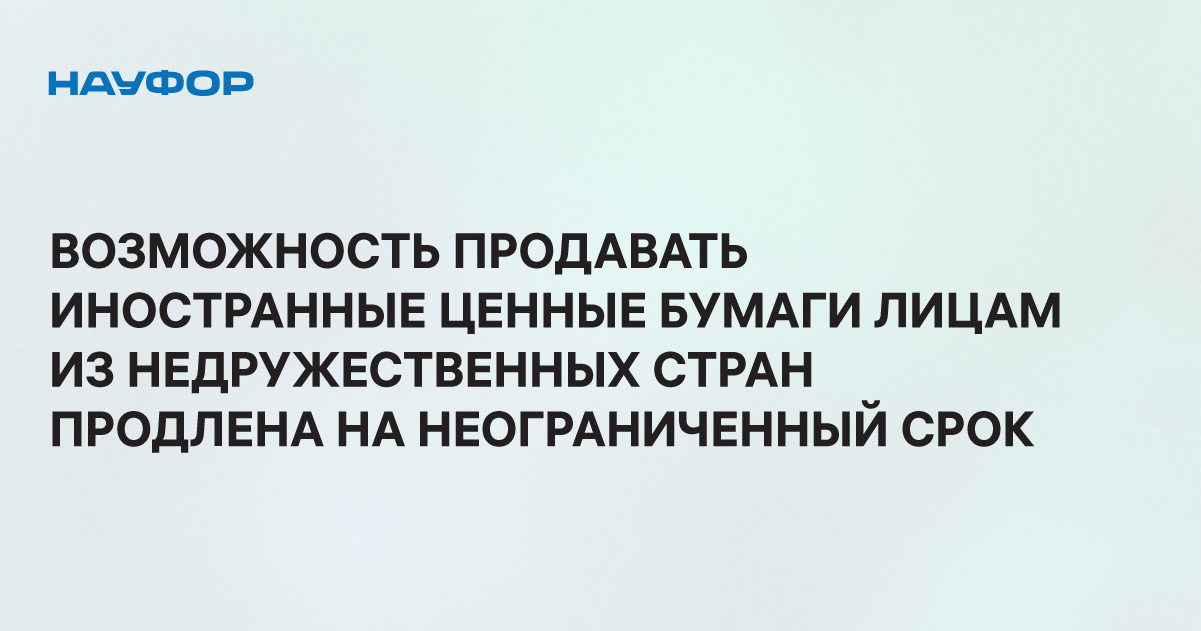 Правительственная комиссия по контролю за осуществлением иностранных инвестиций продлила на неопределенный срок возможность финансовым организациям осуществлять сделки, влекущие за собой возникновение права собственности на иностранные ценные бумаги, отчуждаемые лицам из недружественных государств.