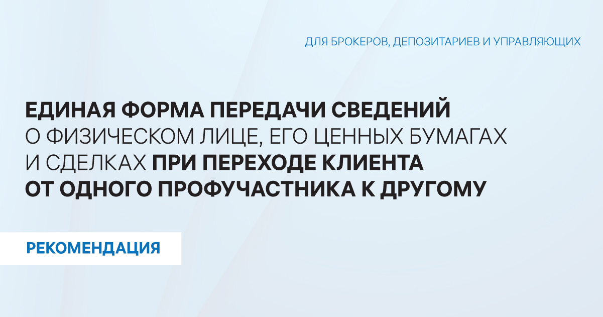 В целях унификации и автоматизации процесса передачи сведений о физическом лице, его ценных бумагах и сделках при переходе клиента от одного профессионального участника к другому, рекомендуем использовать единую форму «Сведения о физическом лице, о его индивидуальном счете (ИИС), брокерском счете (БС), счете доверительного управления (СДУ), активах, подлежащих переводу» (далее - Единая форма), установленную в приложении № 1 к настоящим рекомендациям.