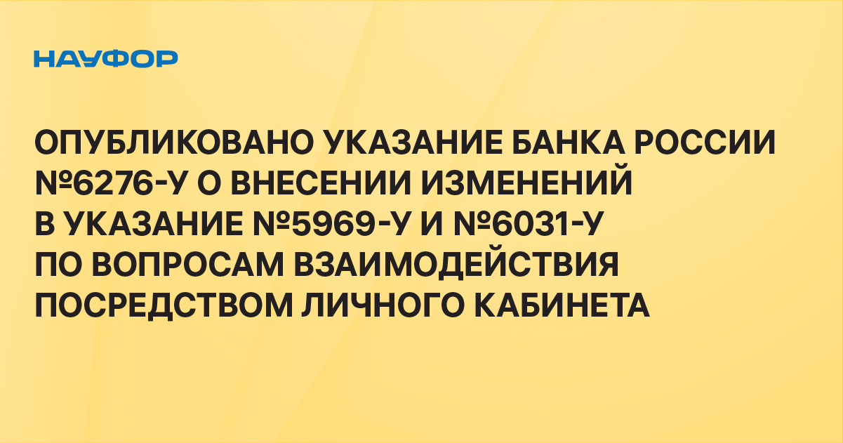 Банк России опубликовал 19 января 2023 года Указание №6276-У от 29 сентября 2022 года "О внесении изменений в Указание Банка России от 5 октября 2021 года №5969-У и Указание Банка России от 23 декабря 2021 года №6031-У по вопросам взаимодействия посредством личного кабинета".