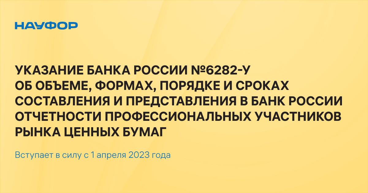 Банк России опубликовал Указание №6282-У от 30 сентября 2022 года "Об объеме, формах, порядке и сроках составления и представления в Банк России отчетности профессиональных участнков рынка ценных бумаг, организаторов торговли и клиринговых организаций, а также другой информации".
