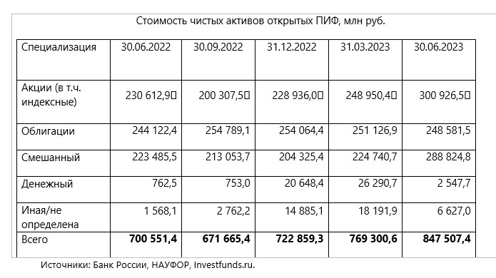 Стоимость чистых активов открытых ПИФ (с учетом заблокированных активов) по итогам второго квартала 2023 года приблизилась к 850 млрд рублей, увеличившись на 17% с начала года, говорится в обзоре «Анализ рынков и показателей паевых инвестиционных фондов за период с 1 апреля по 30 июня 2023 года», подготовленном Национальной ассоциацией участников фондового рынка.