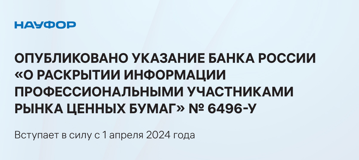 Банк России 24 ноября 2023 года опубликовал Указание «О раскрытии информации профессиональными участниками рынка ценных бумаг». Указание вступает в силу с 1 апреля 2024 года.