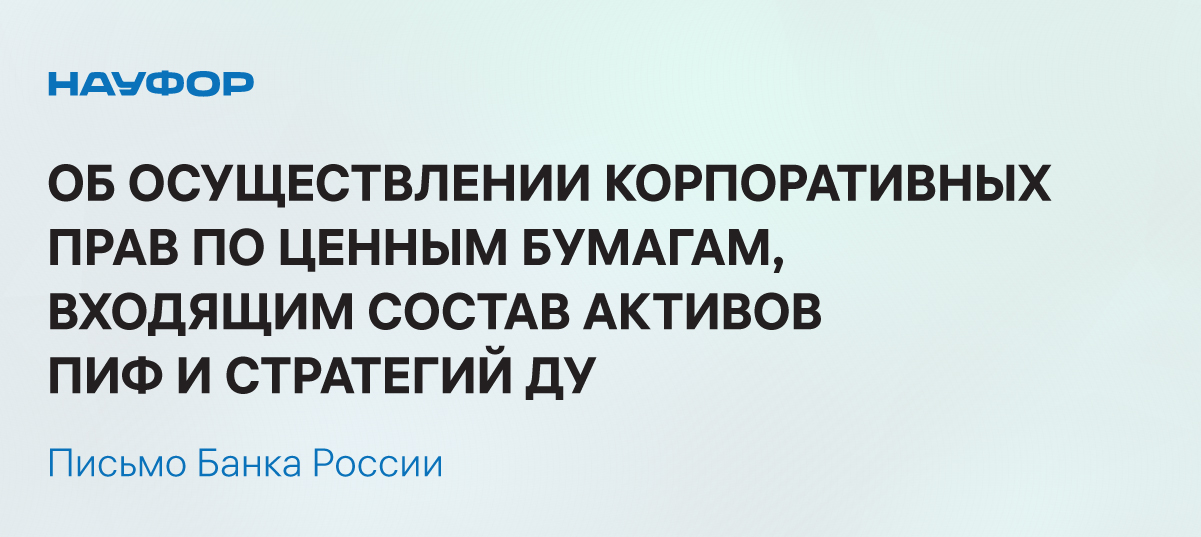 Департамент инвестиционных финансовых посредников Банка России обращает внимание управляющих ПИФ и ДУ на практики осуществления корпоративных прав по ценным бумагам, входящим в состав активов ПИФ и стратегий ДУ.