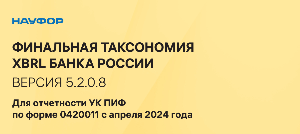 Банк России подготовил и опубликовал финальную таксономию 5.2.0.8, которая должна использоваться УК ПИФ для представления отчетности об операциях с денежными средствами по форме 0420011, установленной в приложении 1 к Указанию № 6054-У2, начиная за отчетные периоды с апреля по декабрь 2024 года.