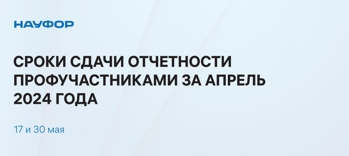 НАУФОР напоминает своим членам - профессиональным участникам рынка ценных бумаг о сроках представления в Центральный Банк отчетности и иной информации за апрель 2024 года.