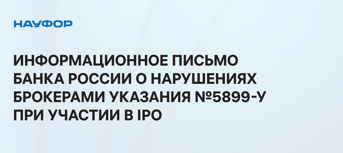 Департаментом инвестиционных финансовых посредников Банка России (далее - Департамент) при осуществлении надзорных мероприятий в отношении отдельных профессиональных участников рынка ценных бумаг, осуществляющих брокерскую деятельность (далее - Брокеры), которые принимают участие в процессе публичного размещения (предложения) акций эмитентов на бирже (далее - IPO), в части соответствия их деятельности требованиям Указания Банка России от 23.08.2021 № 5899-У «Об обязательных для профессиональных участников рынка ценных бумаг требованиях, направленных на выявление конфликта интересов, управление им и предотвращение его реализации» (далее - Указание № 5899-У) установлено следующее.