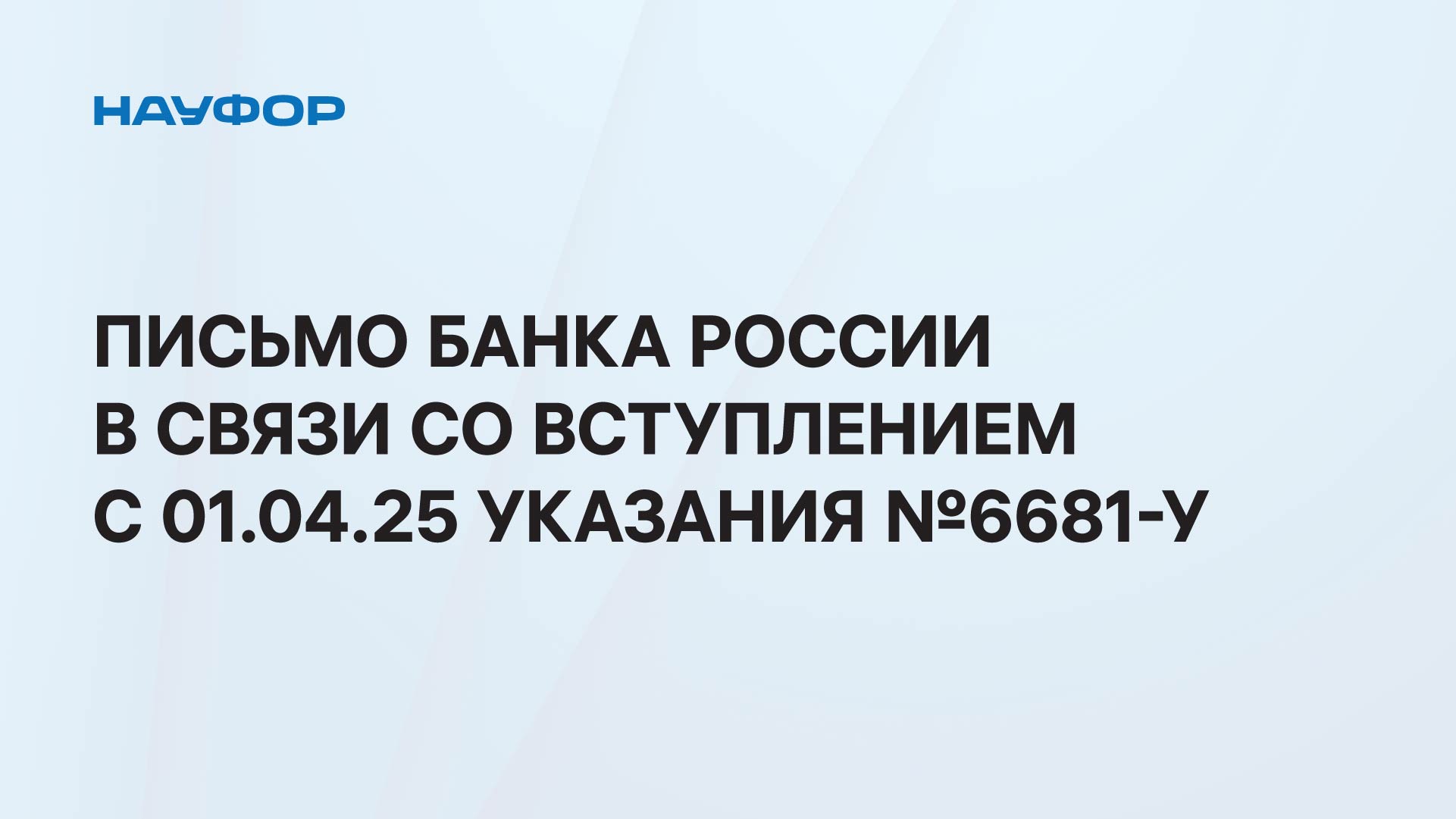 Департамент инвестиционных финансовых посредников Банка России направил в НАУФОР письмо для профессиональных участников, осуществляющих брокерскую деятельность, в связи с предстоящим 1 апреля 2025 года вступлением в силу Указания № 6681-У "О требованиях к осуществлению брокерской деятельности при совершении брокером отдельных сделок за счет клиента".