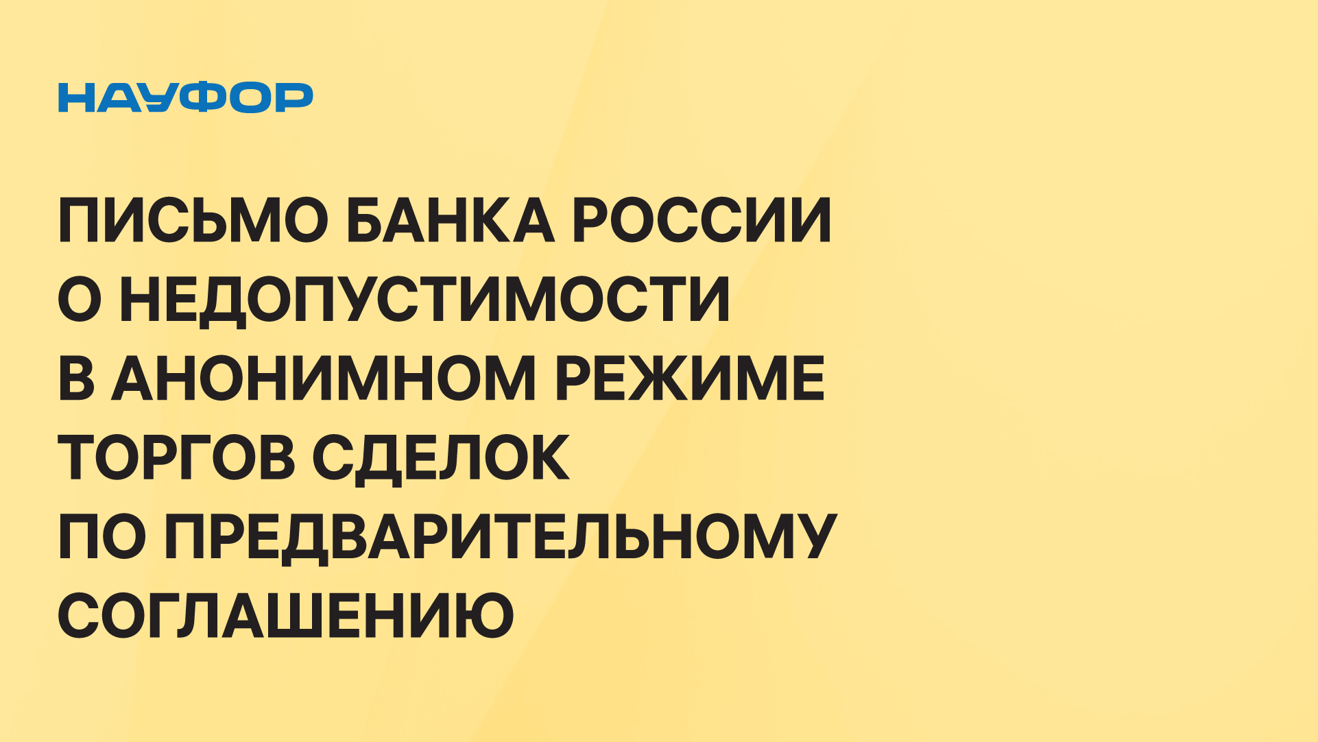 Банк России обращает внимание на недопустимость совершения сделок по предварительному соглашению в анонимном режиме торгов. Для совершения операций с контрагентами по предварительной договоренности следует использовать режимы торгов, предполагающие выставление сторонами исключительно адресных заявок.