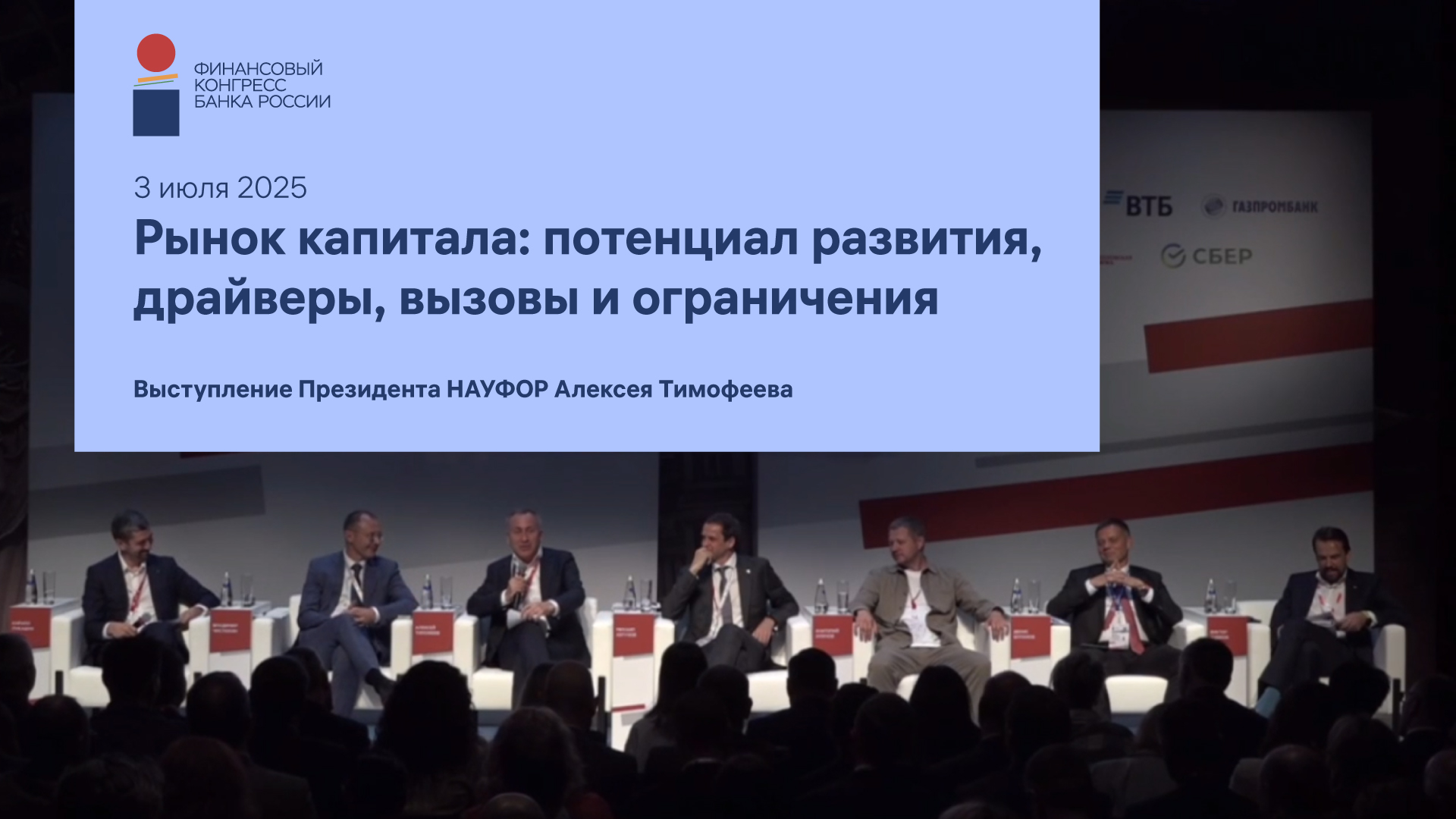 Президент НАУФОР Алексей Тимофеев выступил в четверг, 3 июля, на Финансовом конгрессе Банка России в сессии "Рынок капитала: потенциал развития, драйверы, вызовы и ограничения".