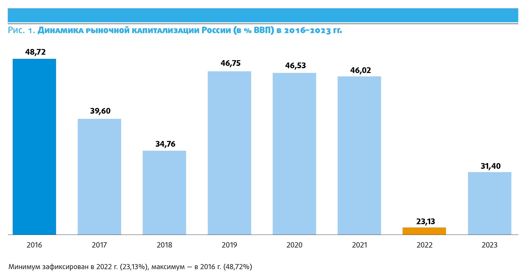 За 2010-е капитализация РФ колебалась в диапазоне 20-50% ВВП, не демонстрируя восходящего тренда, несмотря на рост проникновения инвестиций, и к концу 2020 г. она составляла 46,7% ВВП, что лишь немного выше уровня 2007 г.