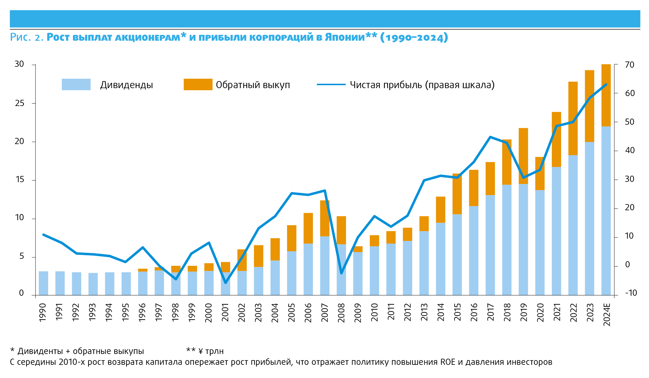 За 2013-2023 гг. совокупные дивиденды японских компаний выросли с около 5 трлн иен до 16 трлн иен, а байбэки - с почти 1 трлн иен до рекордных 10 трлн иен в 2023 г. В итоге средний P/B по TOPIX поднялся с 0,9 в 2013 г. до 1,25 в 2023 г., а число компаний с P/B больше <1 сократилось (хотя всё ещё около 50% первого эшелона TSE). Для решения этой проблемы TSE с 2023 г. перешла к 2 фазе реформ: в марте 2023 г. биржа разослала компаниям с P/B <1 требование раскрыть планы повышения данного показателя выше 1 - фактически, потребовала признать проблему и составить план повышения показателя.