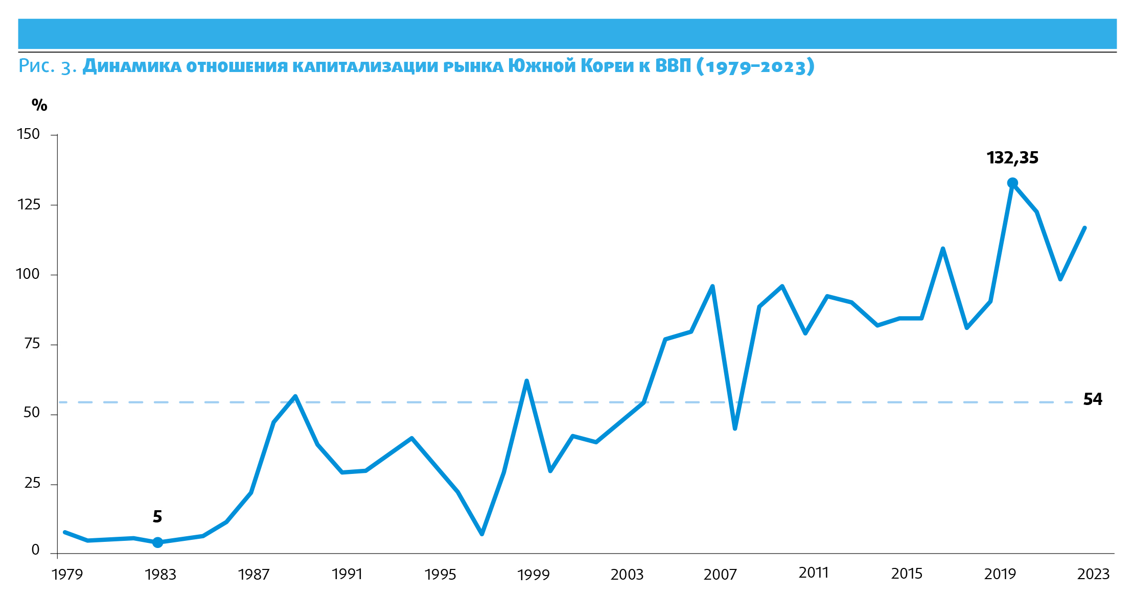 Южная Корея - пример страны, сумевшей превратить институты и реформы в рост фондового рынка: капитализация KOSPI резко увеличилась в последние годы, достигнув 115% ВВП в 2023 г. (против 54% в среднем в 1980-2020 гг.).