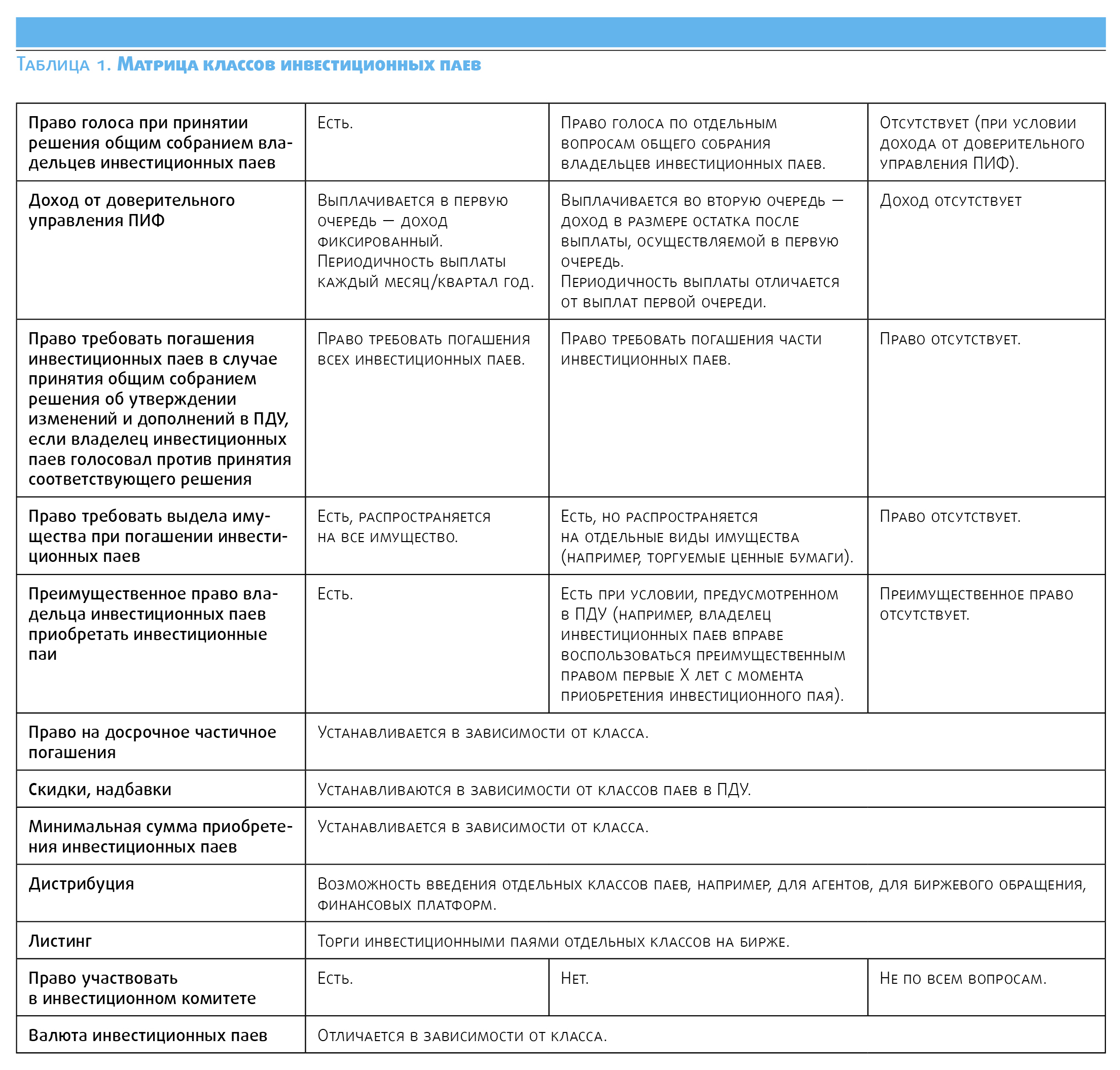 По итогам анализа возможных различий по классам паев была составлена Матрица классов инвестиционных паев (табл. 1).