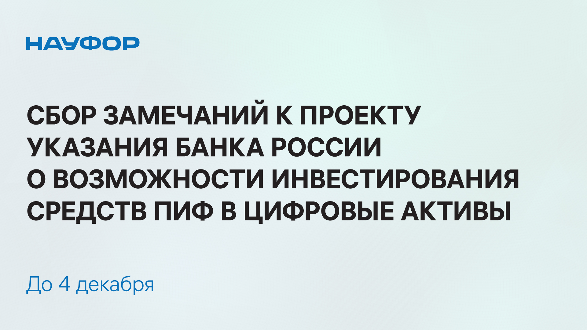 НАУФОР до 4 декабря включительно проводит сбор комментариев к проекту, для внесения предложений и замечаний нужно заполнить форму и отправить ее на почту Павлу Седельникову sedelnikov@naufor.org.