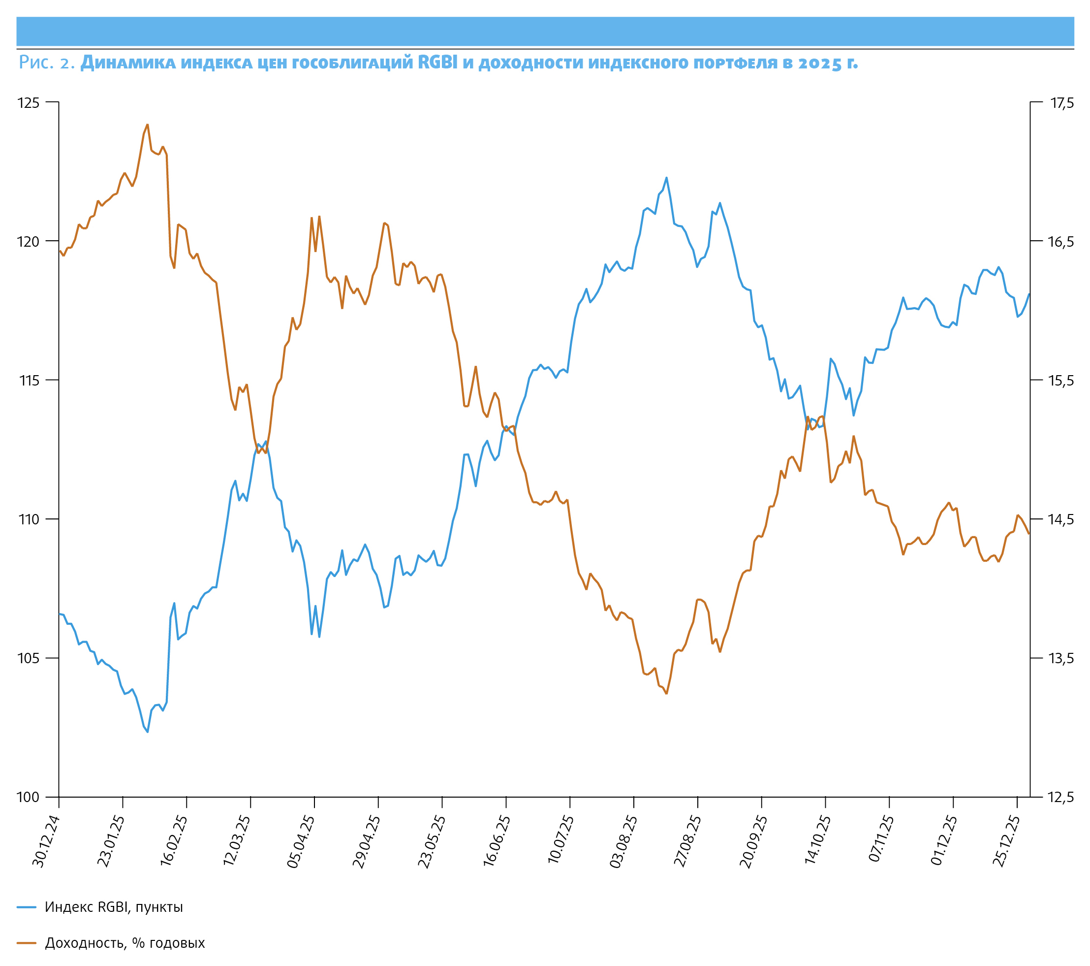 Рынок облигаций федерального займа, заметно упавший в 2024 году, в 2025 продемонстрировал уверенный рост на фоне замедления инфляции, которое позволило Банку России приступить к смягчению ДКП. Ключевая ставка ЦБ, находившаяся в январе на уровне 21%, к концу года опустилась до 16% годовых. Поддержку рынку оказал также улучшившийся геополитический фактор. Ценовой индекс гособлигаций RGBI за год вырос на 10,8%, а средняя доходность ОФЗ, входящих в состав индикатора, опустилась с 16,43% до 14,39% годовых.