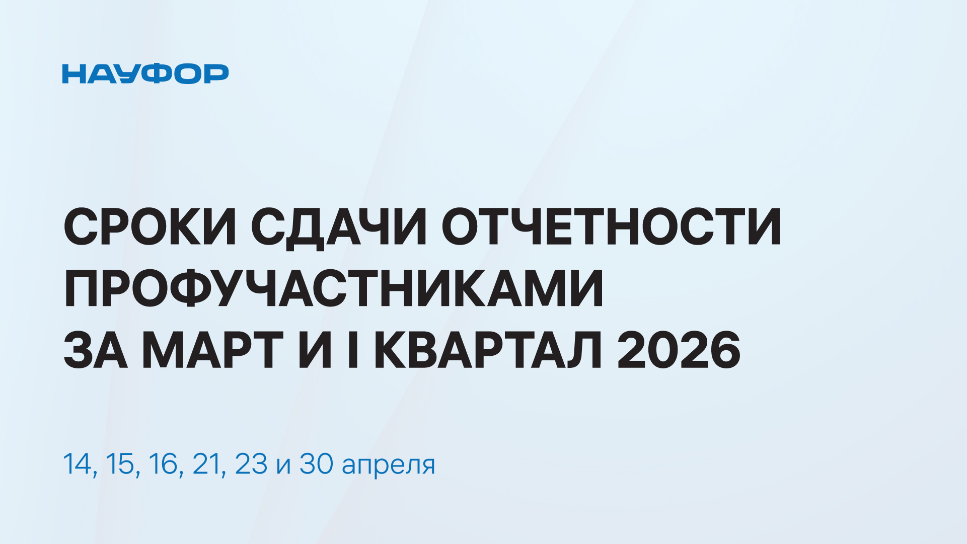 Уважаемые профучастники, напоминаем о сроках представления в Банк России отчетности и иной информации за март и I квартал 2026 - 14, 15, 16, 21, 23 и 30 апреля.